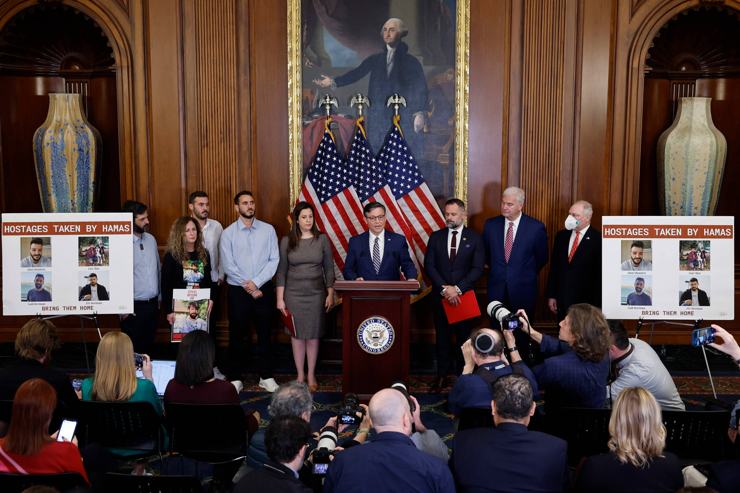 Les dirigeants républicains de la Chambre, apparaissant aux côtés des membres des familles des personnes kidnappées par le Hamas, se sont ralliés aux côtés des démocrates à travers Israël après l’attaque du Hamas du 7 octobre. Mais certains démocrates se sont opposés aux efforts des Républicains pour qualifier d’antisémite la critique d’Israël. Photo de Getty Images