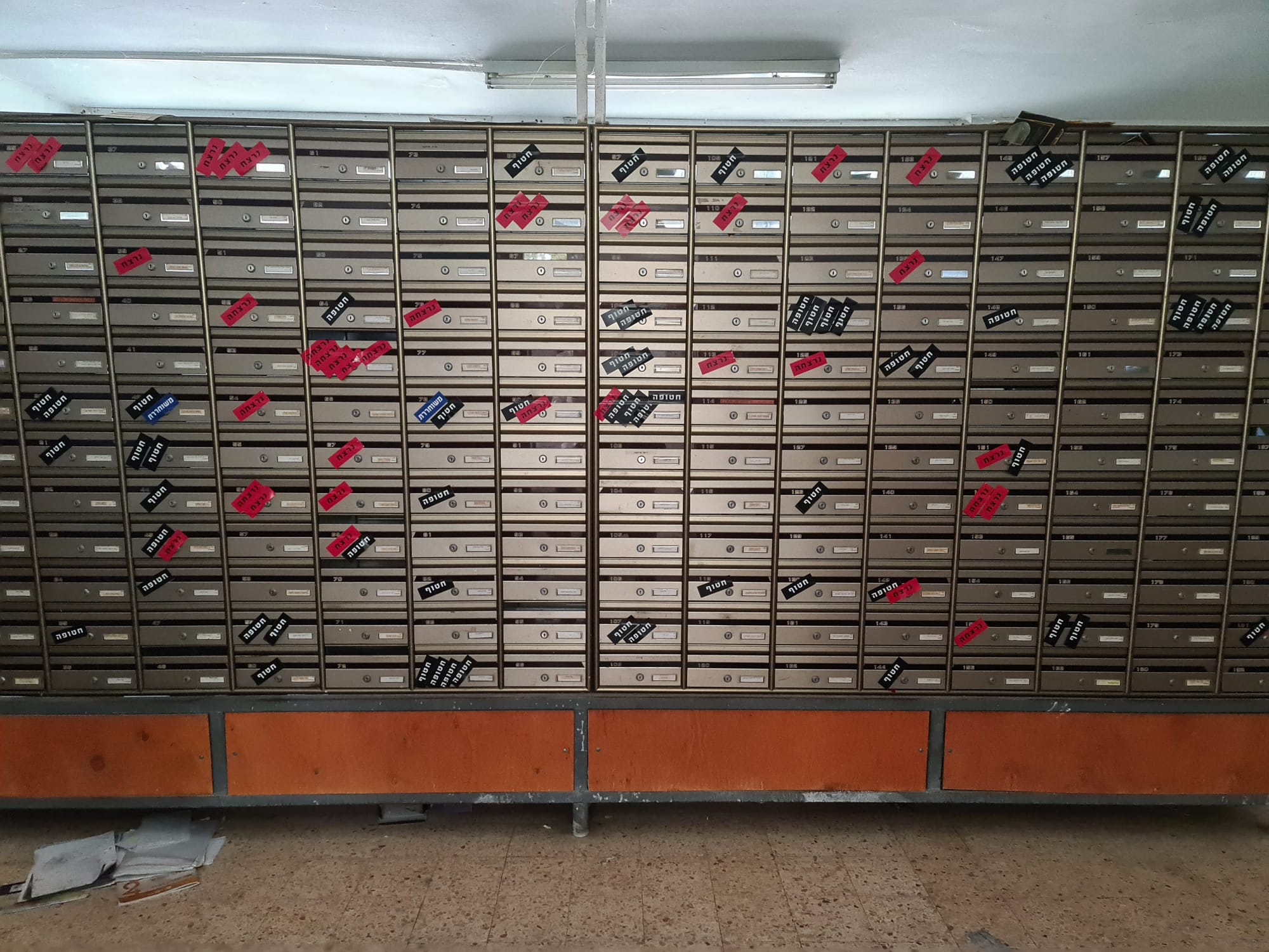 Les boîtes aux lettres du kibboutz Nir Oz sont marquées en rouge pour ceux qui ont été assassinés le 7 octobre, et en noir pour celles prises en otages. (Déborah Danan)