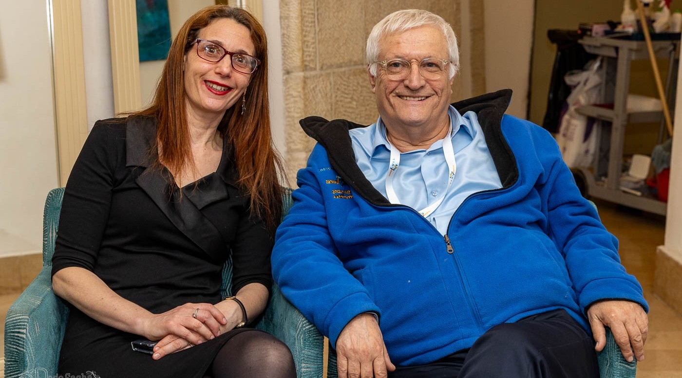 Chaim Chesler, cofondateur du Limmud FSU, et Raheli Baratz-Rix de l’Organisation sioniste mondiale lors de l’événement Limmud FSU en Israël, le 21 décembre 2023. (Alexander Khanin)