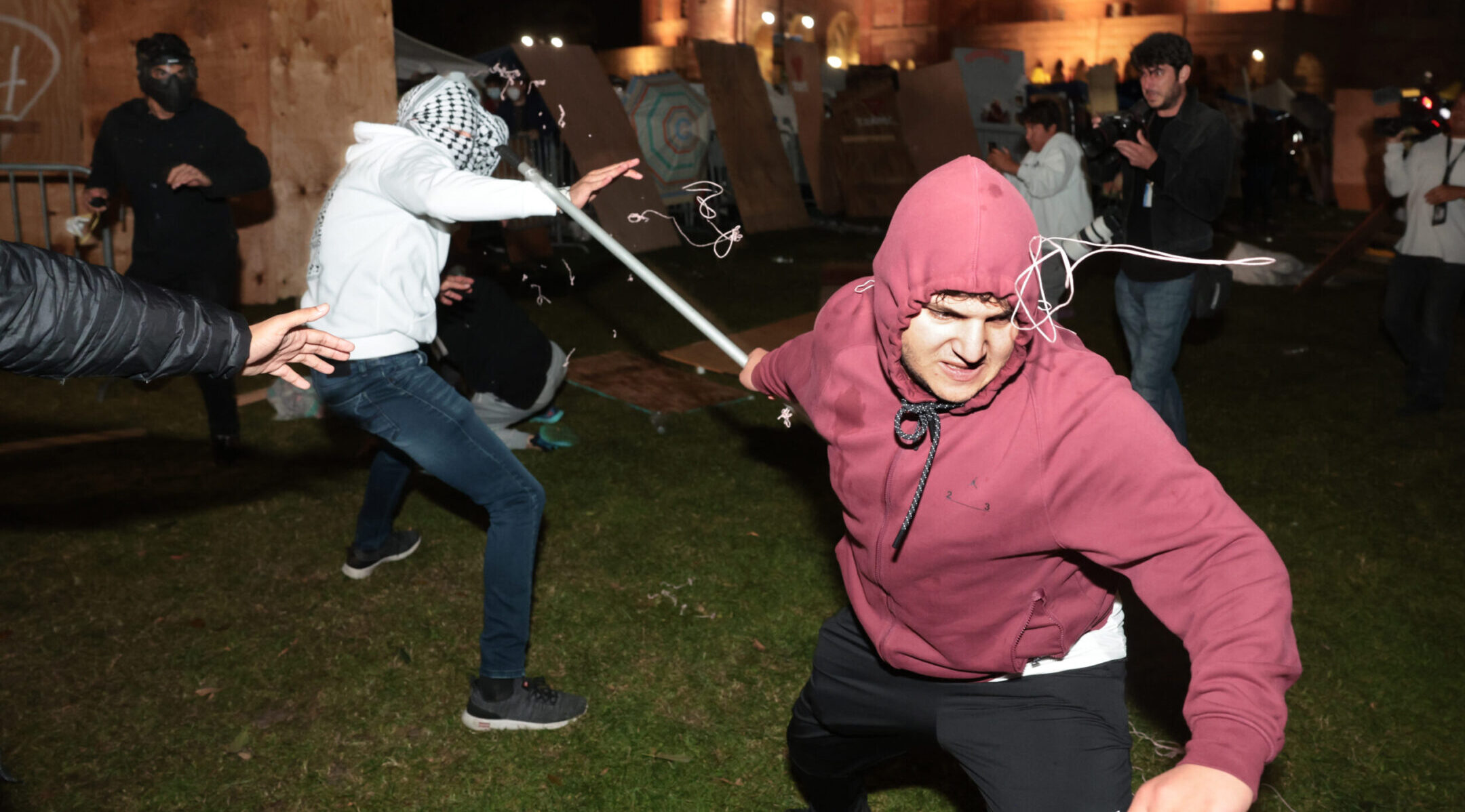 Des manifestants pro-palestiniens et pro-israéliens s’affrontent lors de violences dans un campement de l’UCLA tôt le matin du 1er mai 2024. (Wally Skalij/Los Angeles Times via Getty Images)