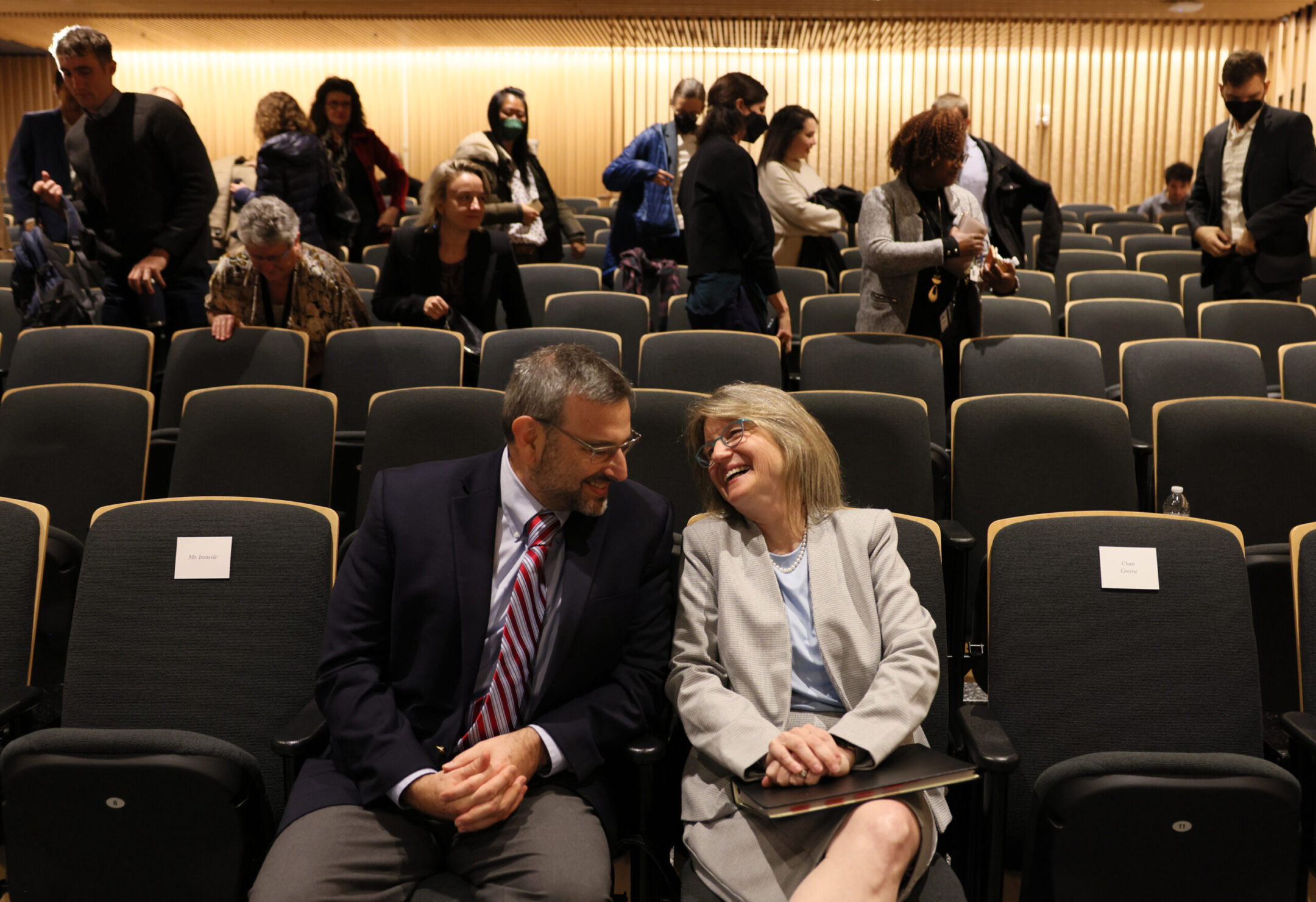 La présidente du MIT, Sally Kornbluth, rit en discutant avec son mari, Daniel Lew, à l’issue d’une conférence de presse organisée pour la présenter comme 18e présidente du MIT, le 20 octobre 2022. (Jessica Rinaldi/The Boston Globe via Getty Images)